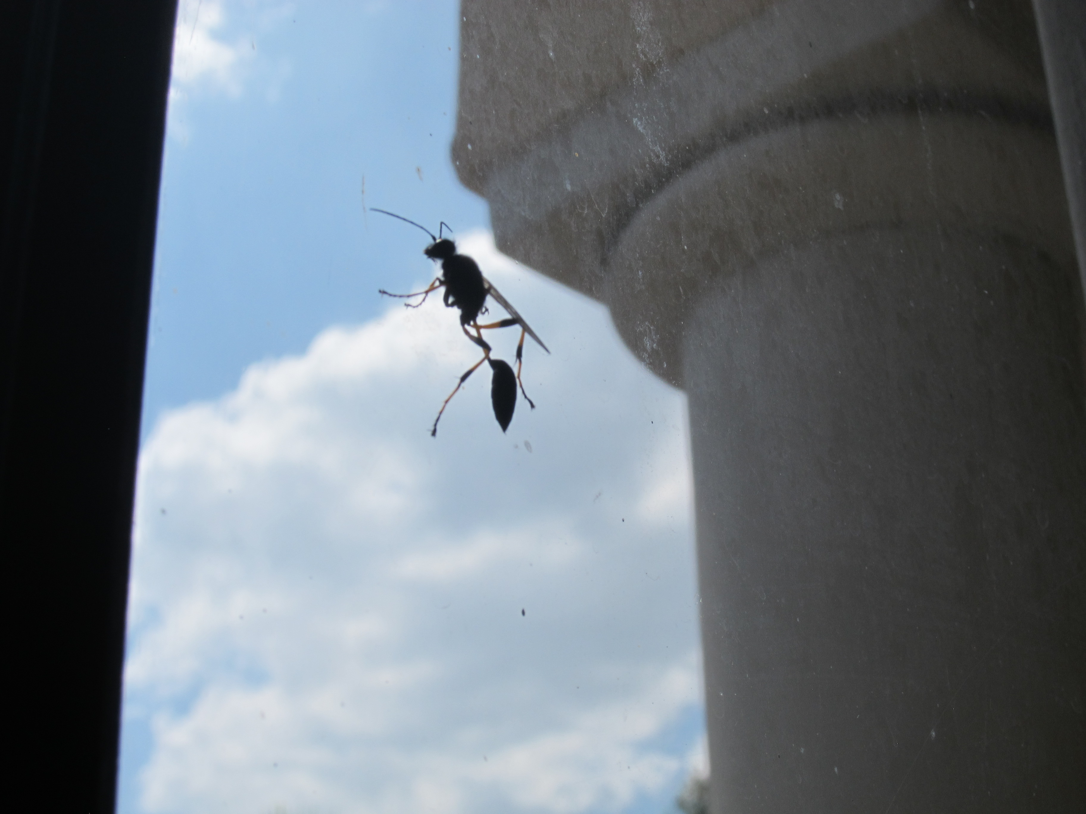 A garden wasp in England is perhaps a centimetre long. These mud daubers are a good inch, perhaps more. Slender, with a defined hourglass shape and sinister long back legs that dangle down make them look even larger in flight. Their loud buzzing and bright markings are worrying, but once you realise they’re not interested in attacking you and will help to keep down the spider population, (yes PLEASE), they’re not so scary anymore.